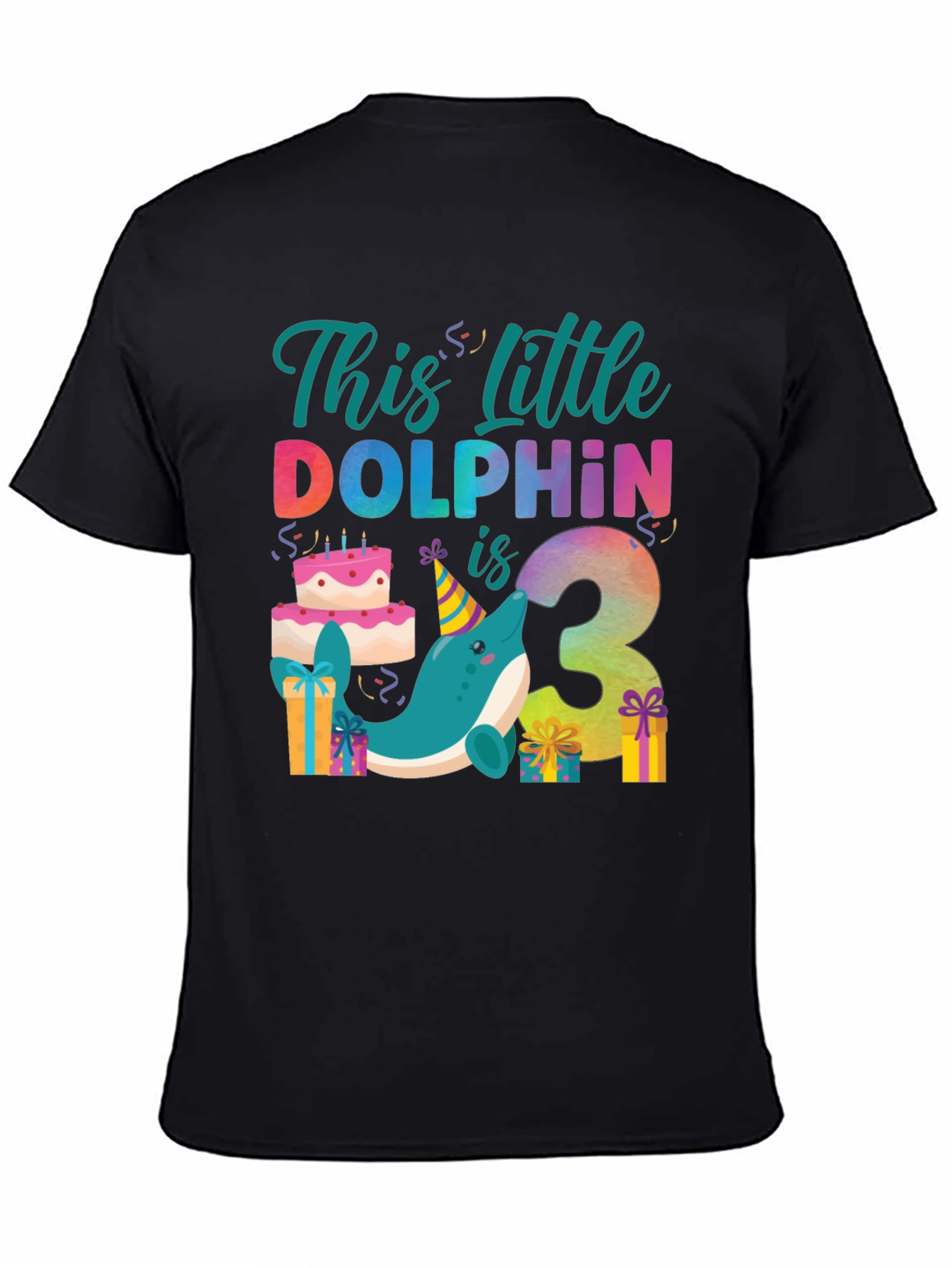 Celebrate a special 3rd birthday with this adorable t-shirt! The black tee features a colorful design with the phrase "This little DOLPHIN is 3", complete with a cute dolphin wearing a party hat. The design includes a birthday cake, wrapped gifts, and confetti, adding to the festive feel. This shirt is perfect for a third birthday party or as a memorable gift for the birthday boy or girl. Made from comfortable fabric, it's ideal for all-day wear during the celebrations. Make their 3rd birthday extra special with this delightful t-shirt!