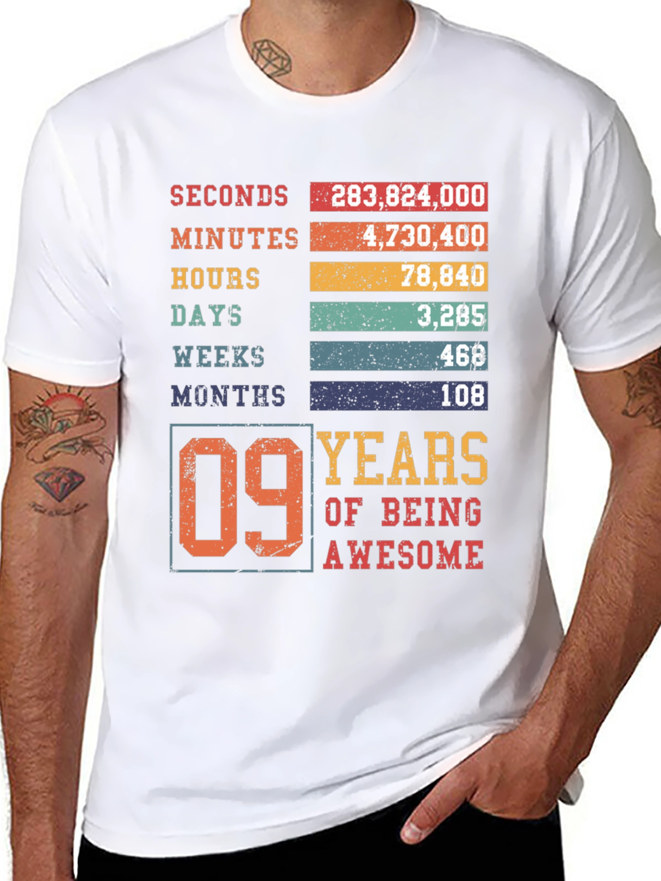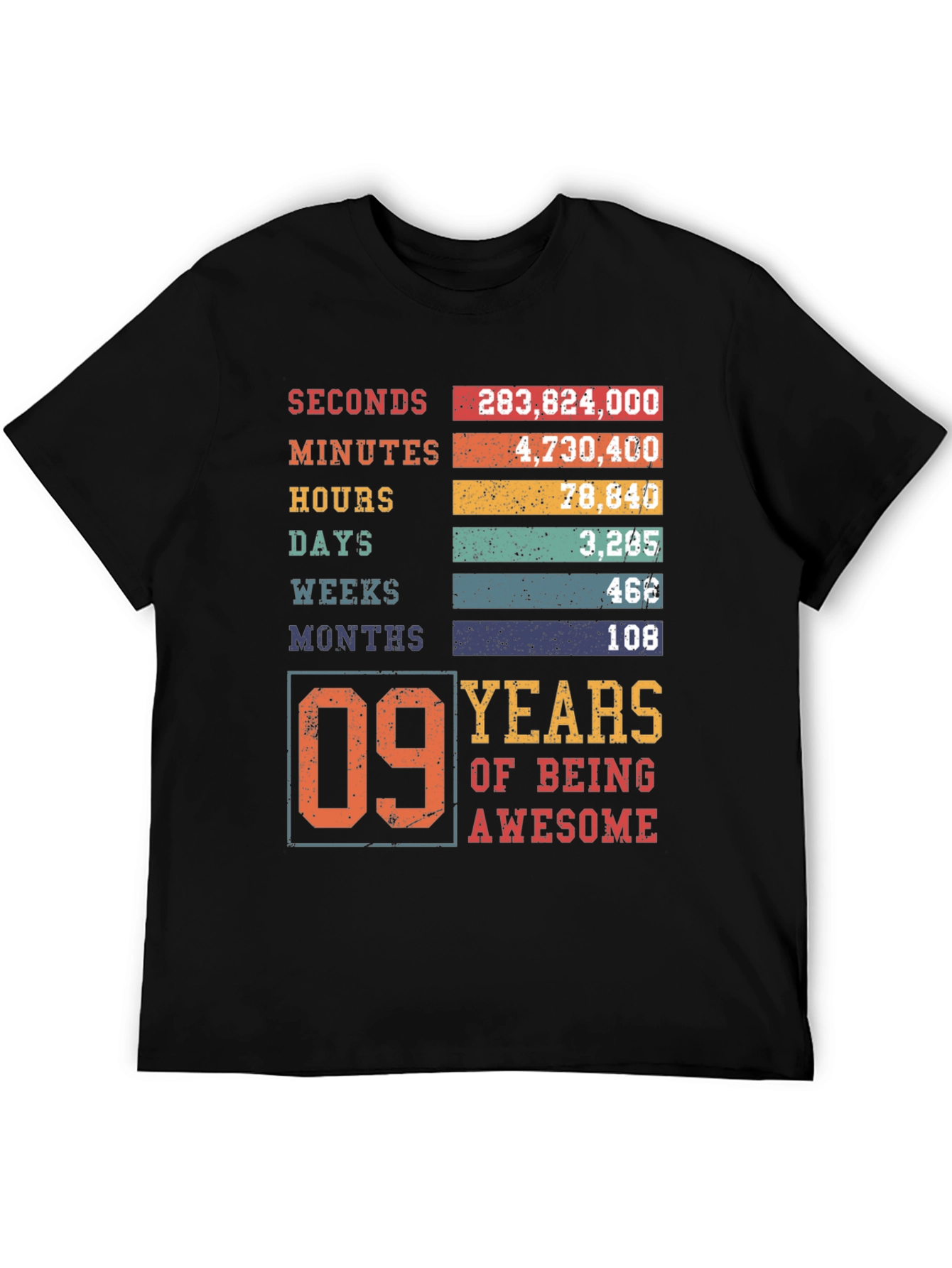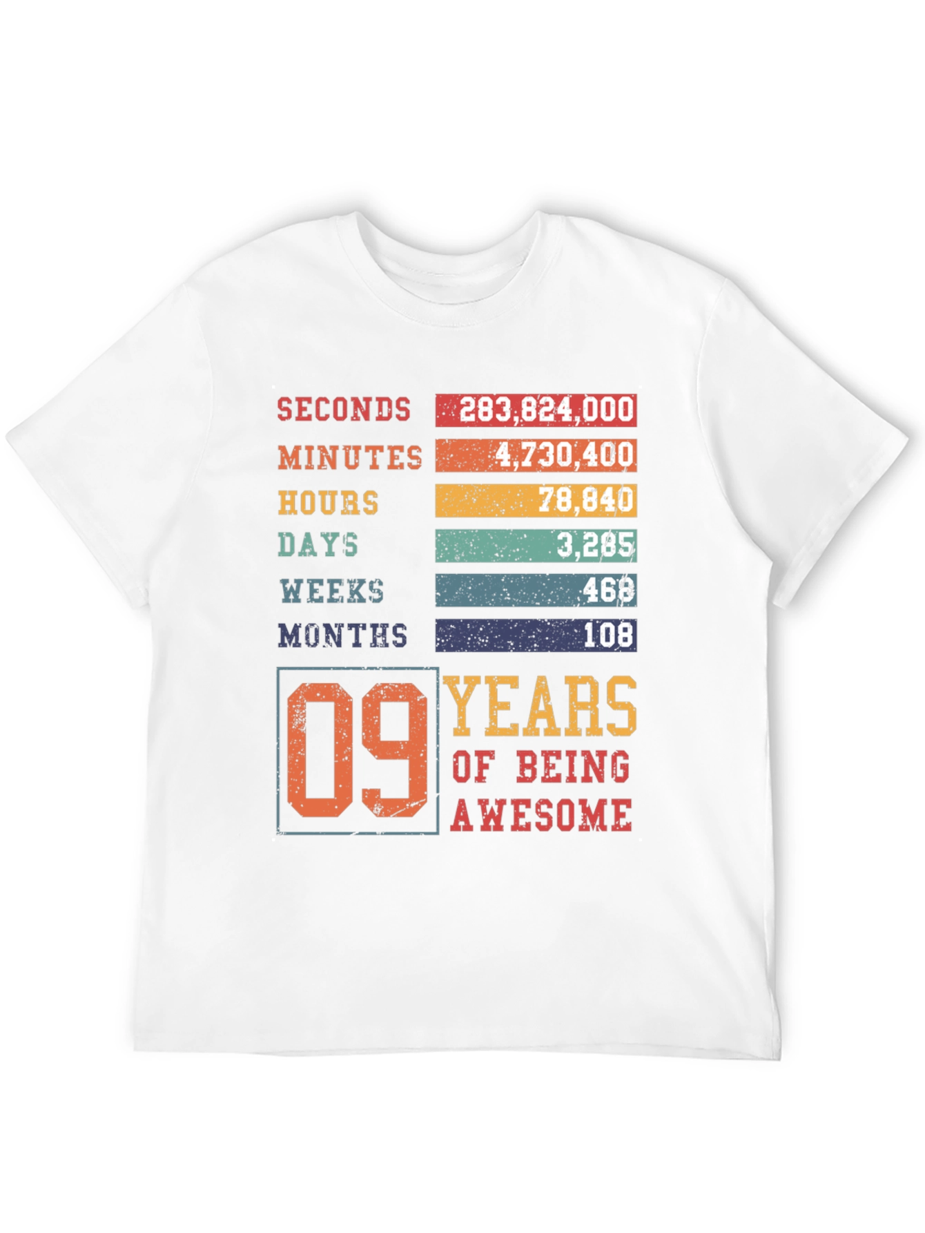 Celebrate a special milestone with this unique "09 Years of Being Awesome" T-shirt. The design features a creative breakdown of the first nine years into seconds, minutes, hours, days, weeks, and months. The shirt is crafted from soft, breathable fabric and offers a comfortable fit for all-day wear. The vibrant, distressed print adds a vintage touch. Makes a perfect birthday gift for a nine-year-old to show off their awesome journey so far. Ideal for birthday parties, family gatherings, or everyday wear to showcase this amazing milestone. Grab yours and make their ninth birthday unforgettable!