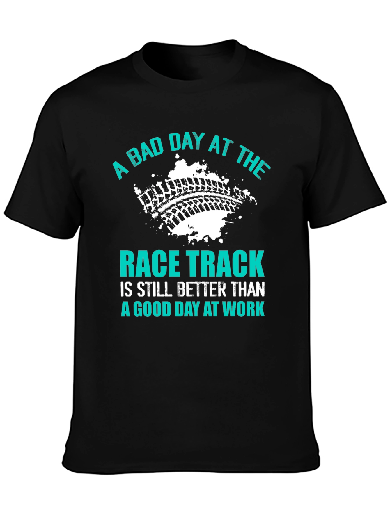 This stylish black t-shirt features a unique design perfect for racing enthusiasts. The graphic includes tire track imagery and the phrase "A Bad Day at the Race Track is Still Better Than A Good Day at Work" in a cool turquoise color. The shirt is made from a comfortable, breathable fabric, making it ideal for everyday wear or a day at the races. Show off your passion for racing with this eye-catching tee. It's a great conversation starter and a must-have for anyone who loves the thrill of the track. Get yours today and let everyone know where you'd rather be!