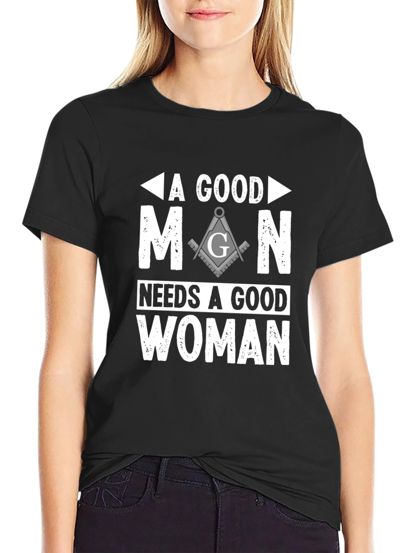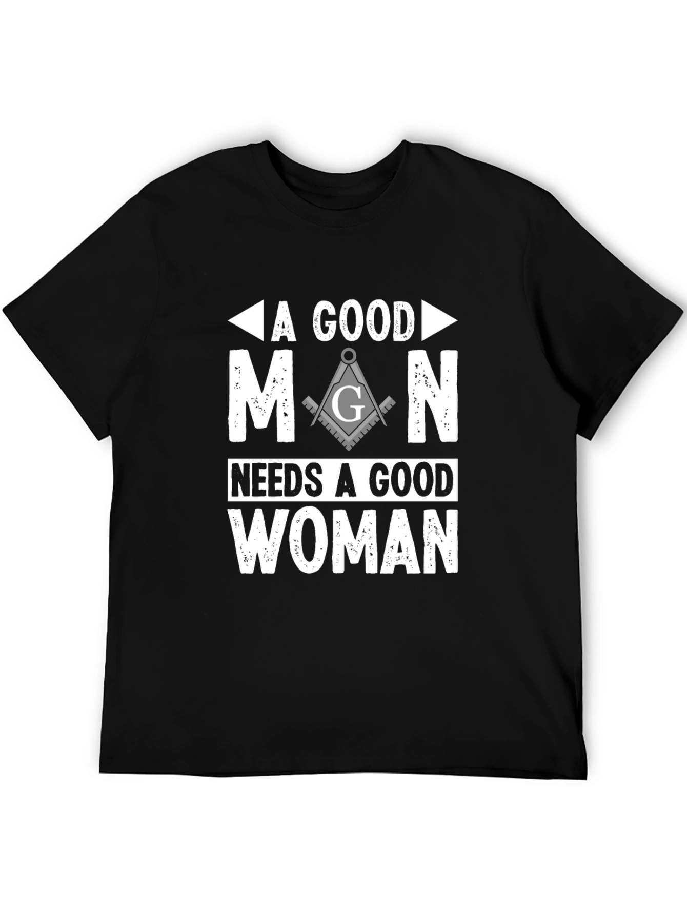 This black t-shirt features a bold graphic print that reads "A GOOD MAN NEEDS A GOOD WOMAN." The word "MAN" is uniquely designed with the Masonic square and compass symbol replacing the letter "A," signifying a connection to Freemasonry. Crafted from a soft, comfortable fabric, this short-sleeved tee is perfect for casual wear. Show off your pride in brotherhood and your appreciation for strong women. This shirt is ideal for Masonic events, casual outings, or as a thoughtful gift for a Freemason or a loved one. Enjoy a comfortable fit and a meaningful message.