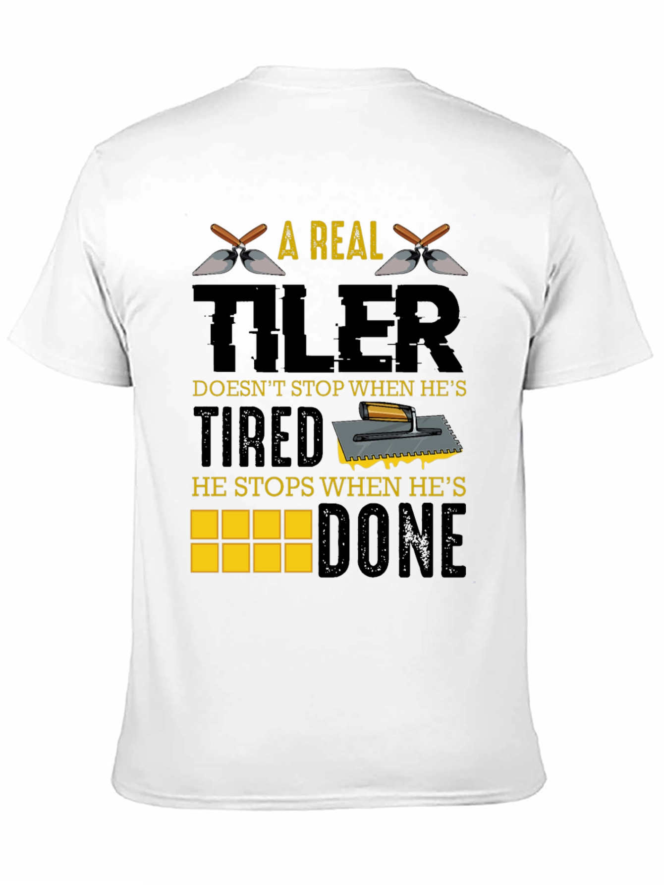 This black t-shirt features a bold and humorous graphic design perfect for tile installers. The design includes trowel illustrations and the saying "A Real Tiler Doesn't Stop When He's Tired He Stops When He's Done." The shirt is made from a soft-looking fabric and appears to be a comfortable fit. The design uses yellow and grey against the dark background making it a bold statement piece. This shirt is ideal for wearing on the job or casually to show off your tiling pride. A great gift for the tile expert in your life!