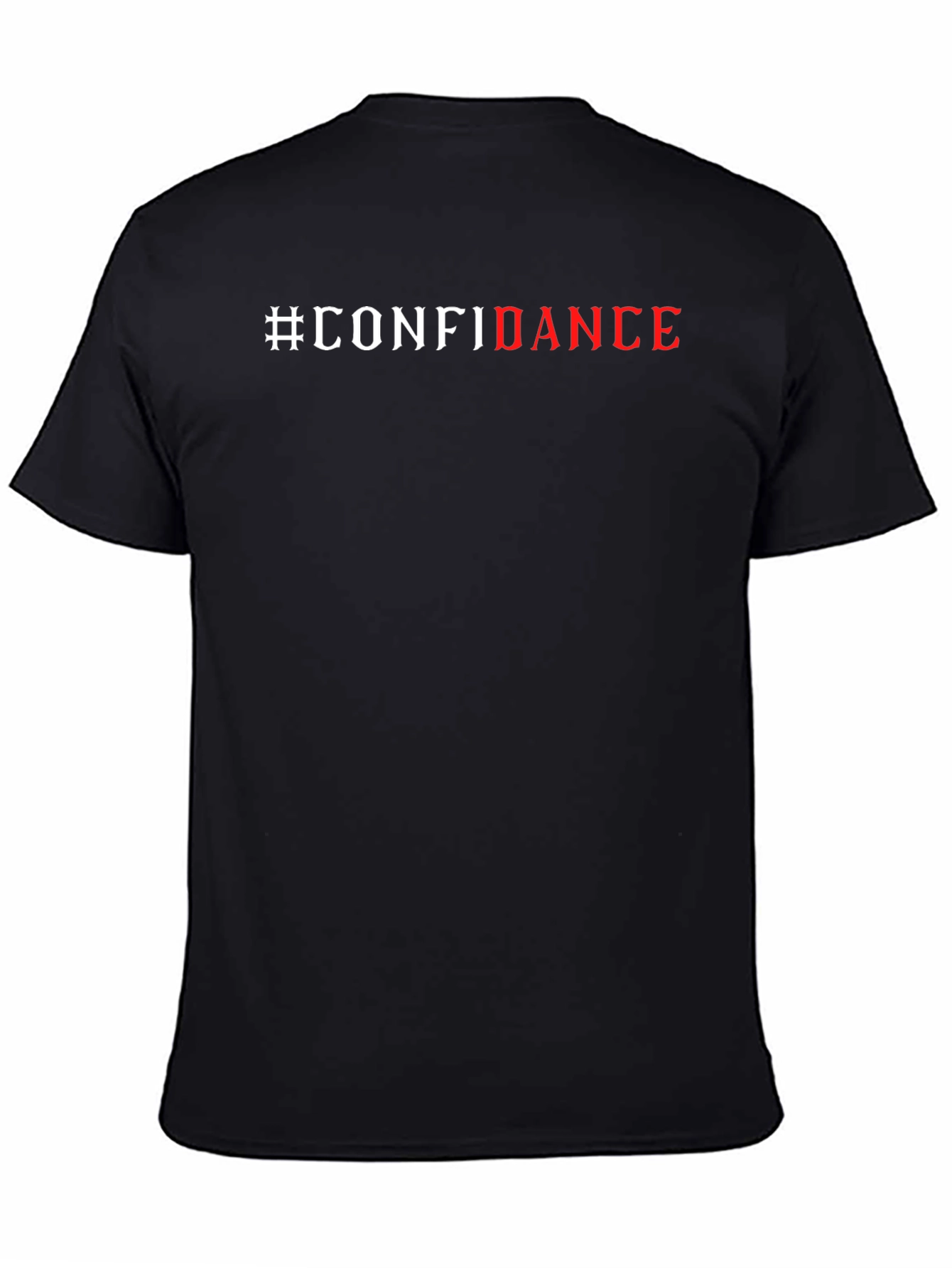 Show your inner confidence with this stylish graphic print t-shirt. This black tee features the word '#CONFIDANCE', with 'DANCE' in a bold red font for emphasis. The short sleeve and comfortable fit make it perfect for everyday wear. Made from a soft and breathable fabric, this t-shirt is ideal for casual outings, gym sessions, or lounging at home. Pair it with jeans, shorts, or joggers for a cool and confident look. Express yourself with this must-have addition to your wardrobe. Get yours today!